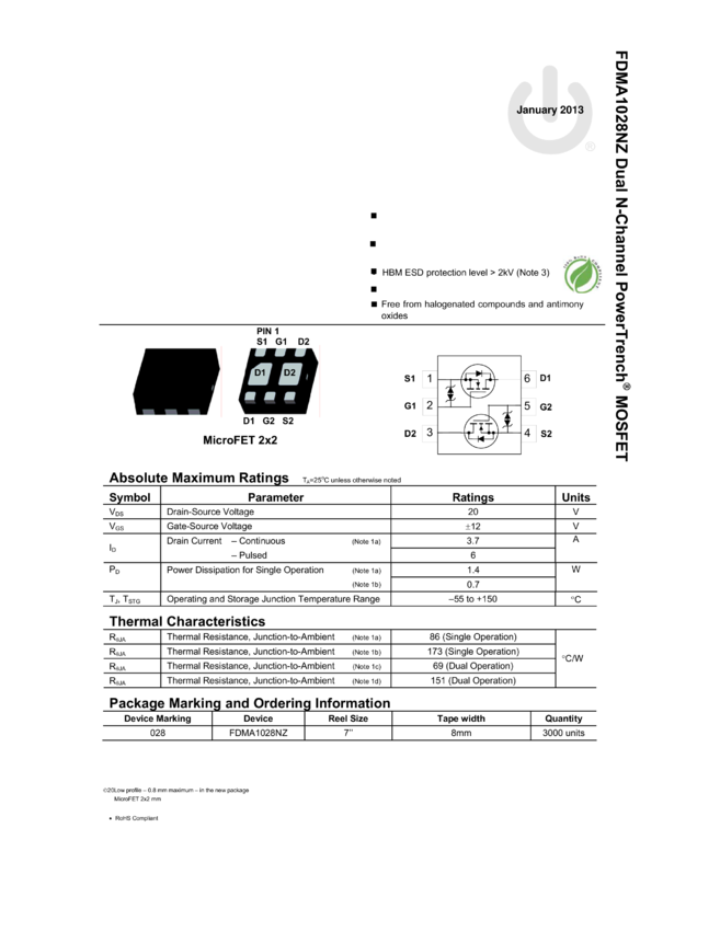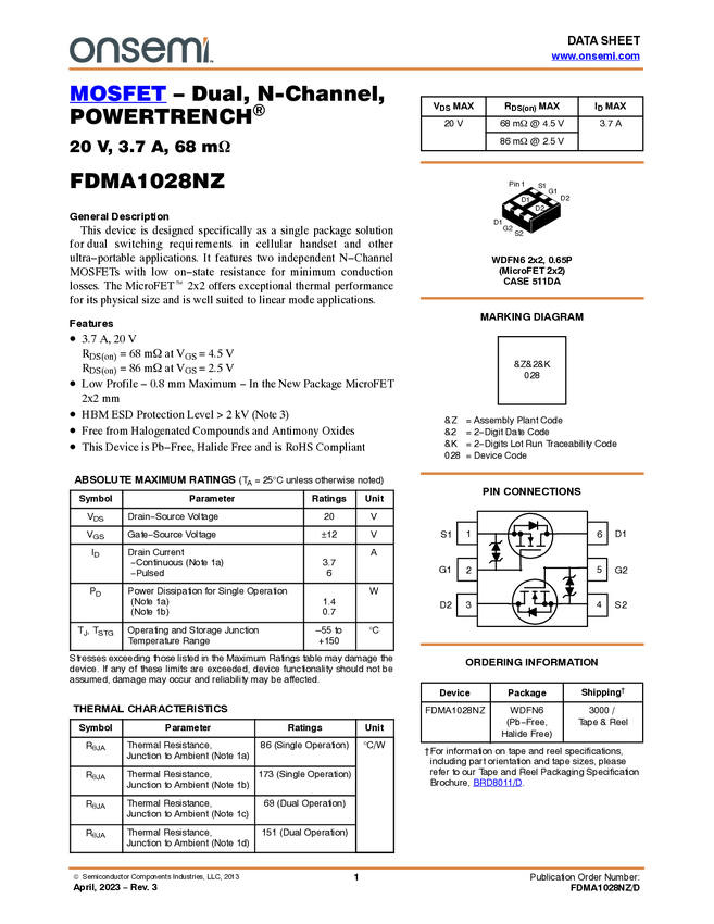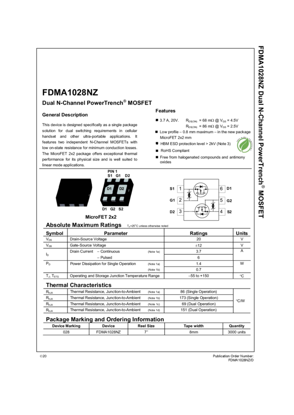 Dual N-Channel PowerTrench<sup>® MOSFET 20V, 3.7A, 68mΩ