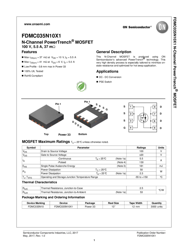 N-Channel PowerTrench<sup>® MOSFET 100 V, 5.5 A, 37 mΩ