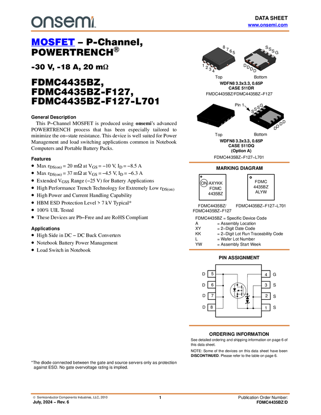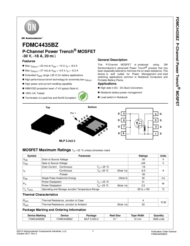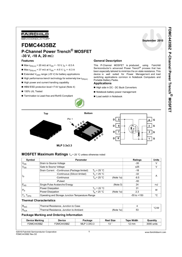 P-Channel Power Trench<sup>® MOSFET -30V, -18A, 20mΩ