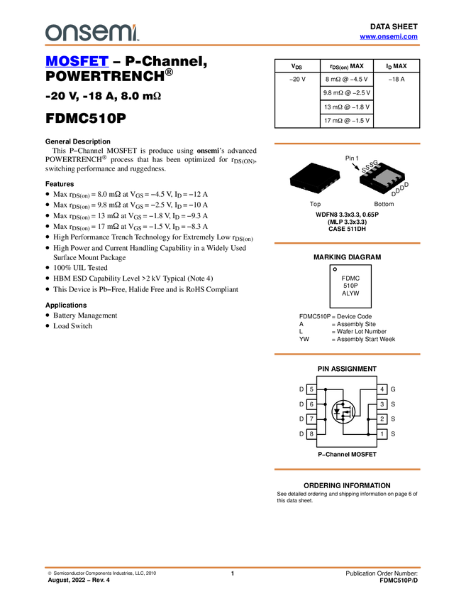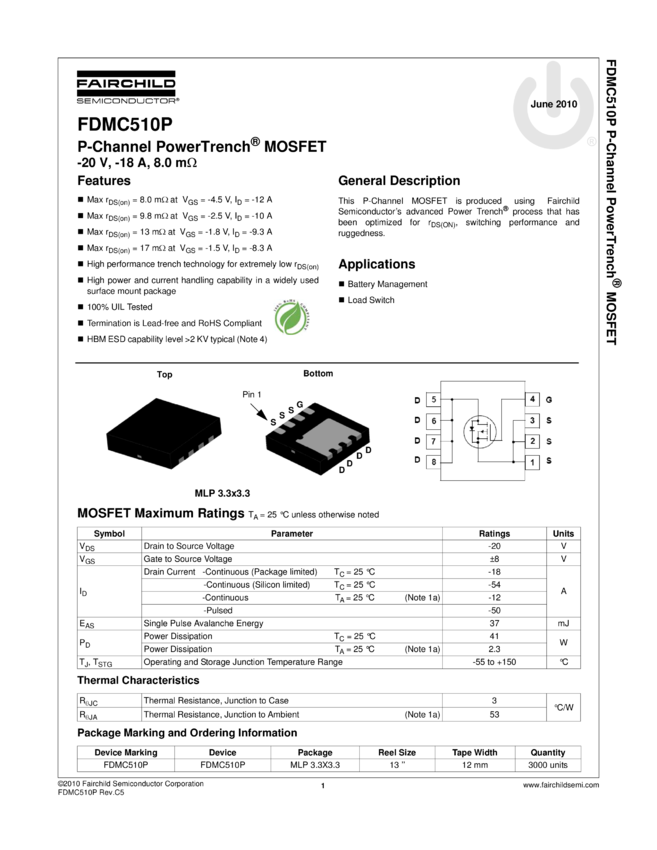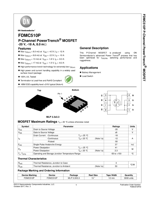 MOSFET, Power, 20V P-Channel, MLP 3.3x3.3