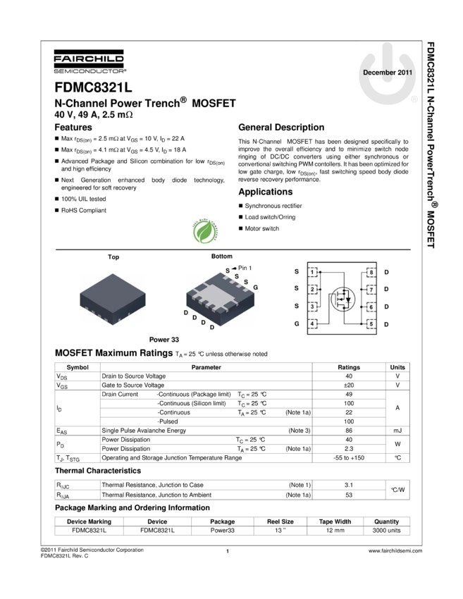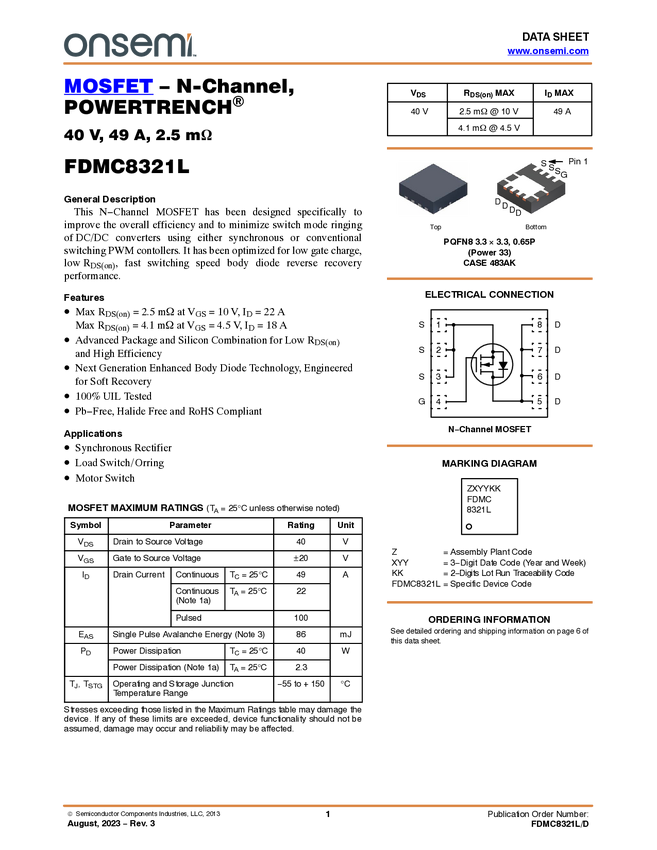 N-Channel Power Trench<sup>® MOSFET 40V, 49A, 2.5mΩ