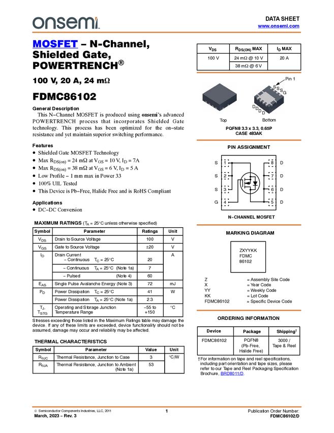 N-Channel Shielded Gate Power Trench<sup>® MOSFET 100V, 20A, 24mΩ