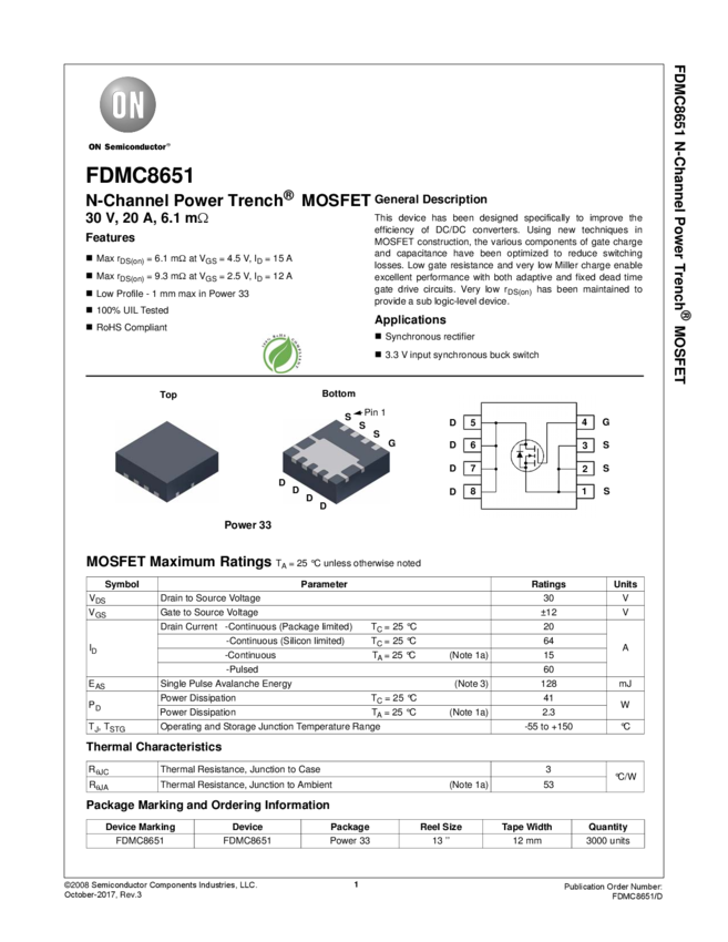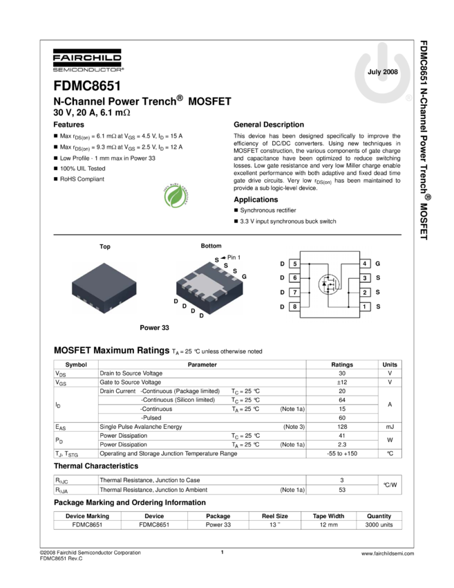 N-Channel Power Trench<sup>® MOSFET 30V, 20A, 6.1mΩ