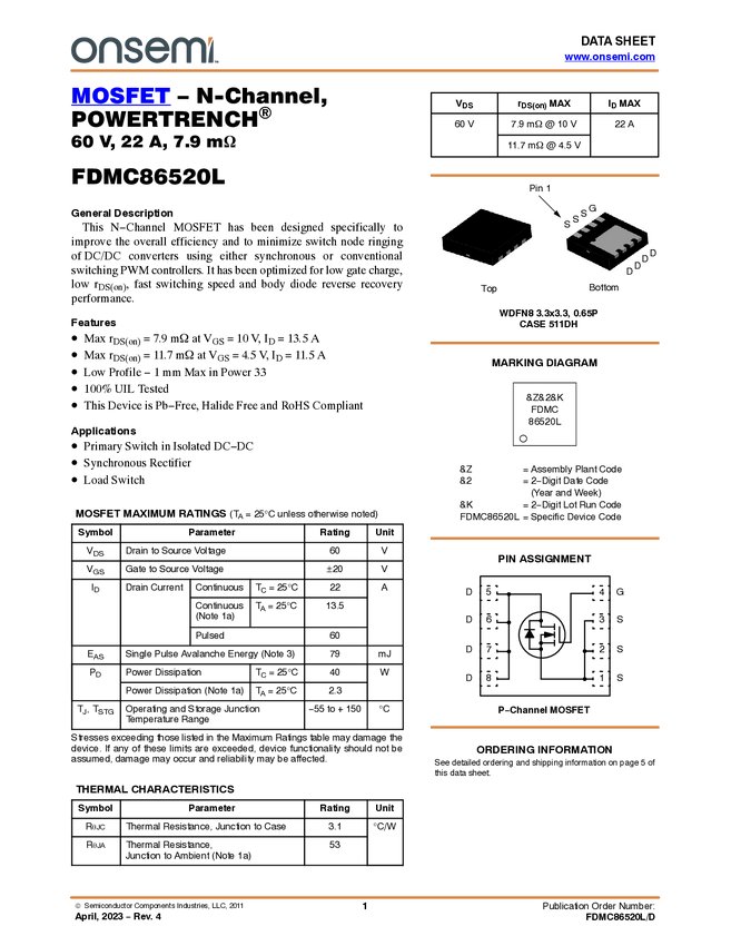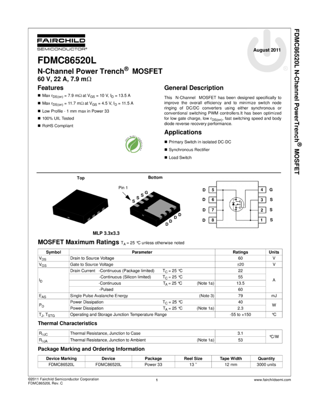 N-Channel Power Trench<sup>® MOSFET 60V, 22A, 7.9mΩ