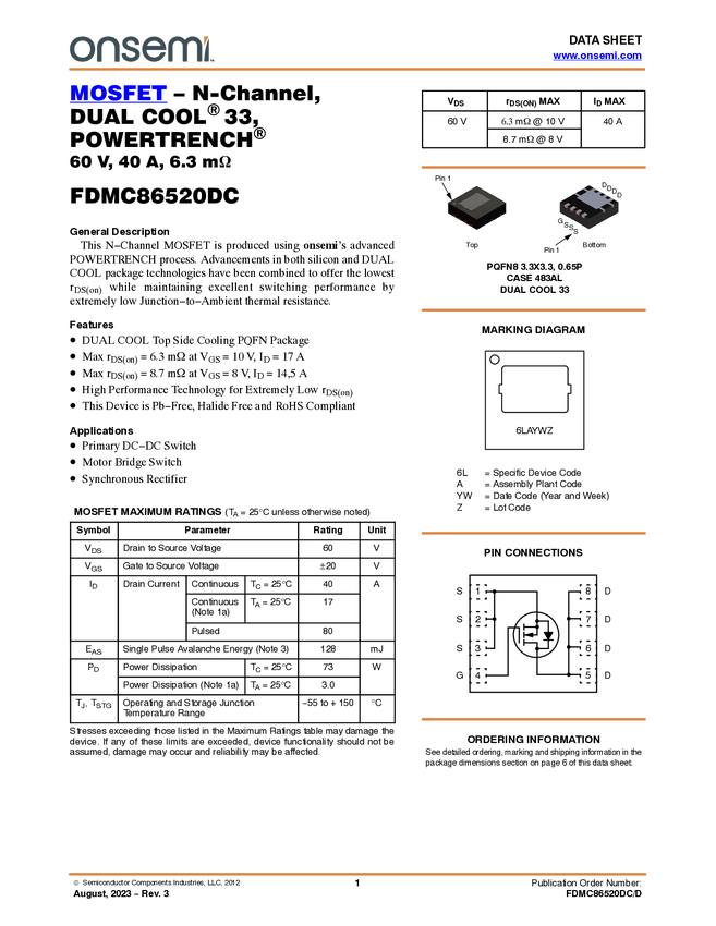 N-Channel Dual Cool<sup>TM 33 PowerTrench<sup>® MOSFET 60V, 40A, 6.3mΩ
