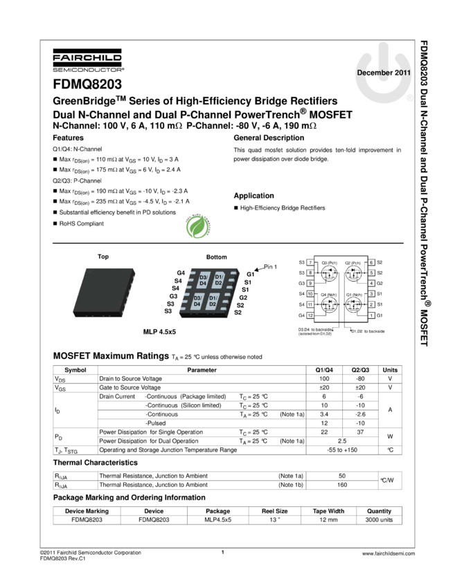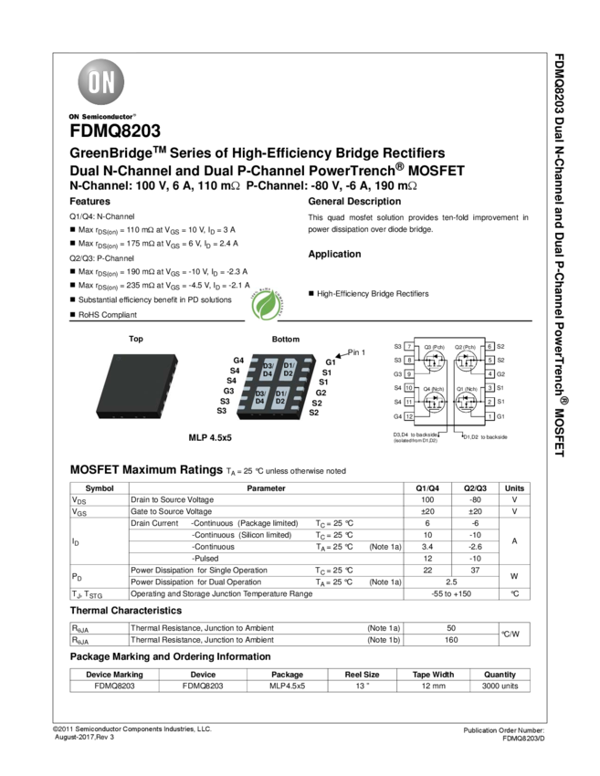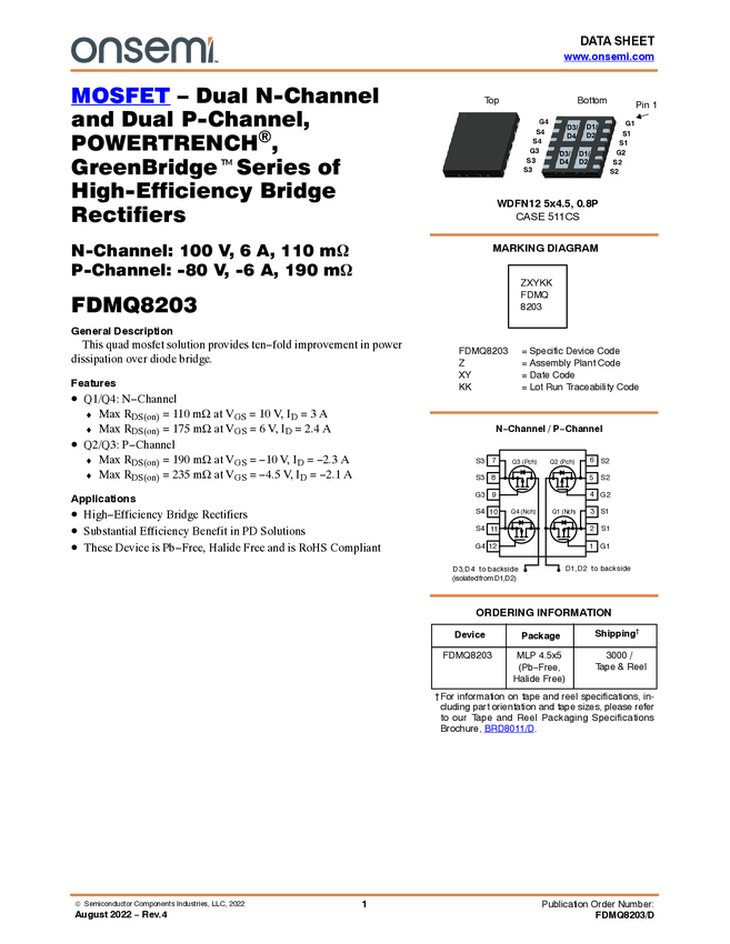 Dual N-Channel and Dual P-Channel PowerTrench® MOSFET, GreenBridge™ Series of High-Efficiency Bridge Rectifiers