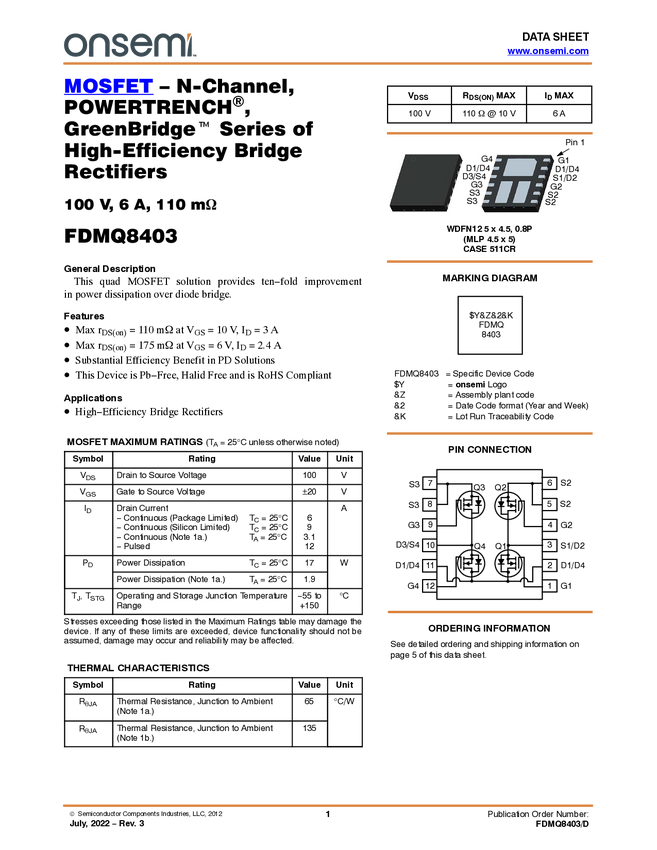 N-Channel PowerTrench<sup>® MOSFET GreenBridge™ Series of High-Efficiency Bridge Rectifiers 100V, 6A, 110mΩ