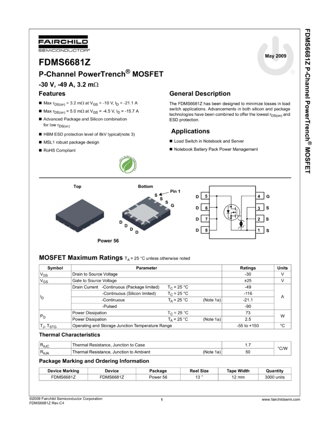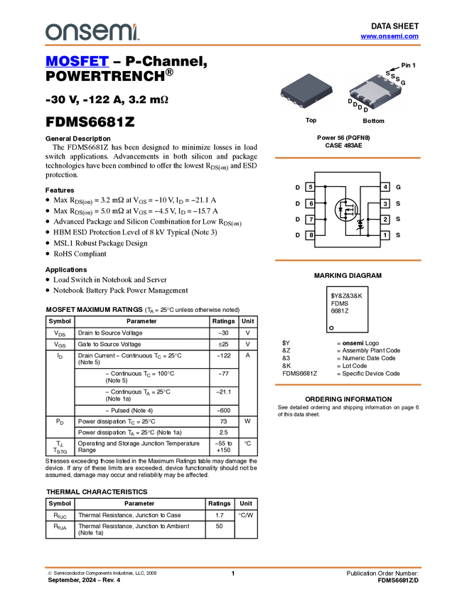 P-Channel PowerTrench<sup>® MOSFET -30V, -122A, 3.2mΩ
