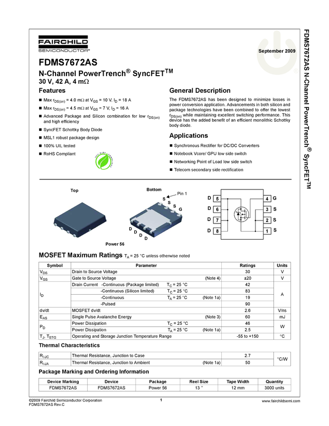 N-Channel PowerTrench<sup>® SyncFET™ 30V, 42A, 4mΩ