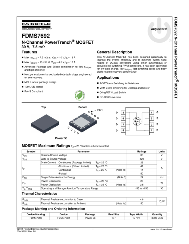 N-Channel PowerTrench<sup>® MOSFET 30V, 7.5mΩ