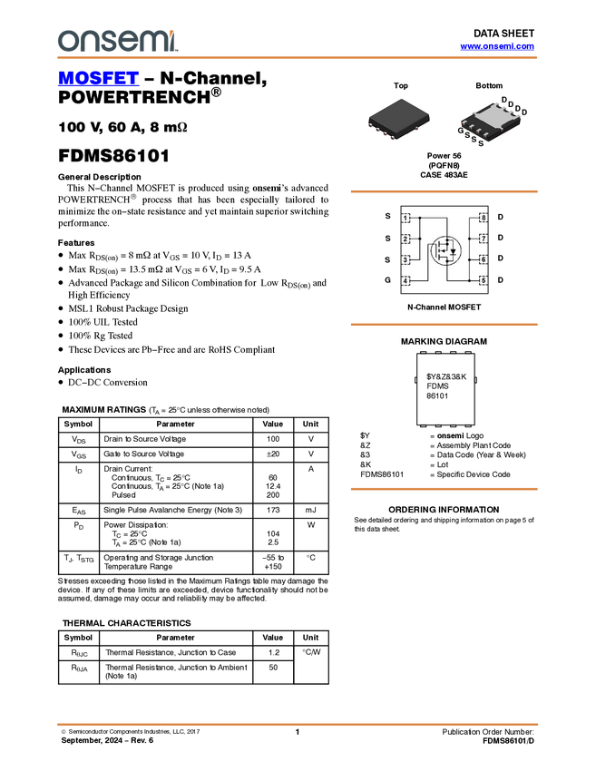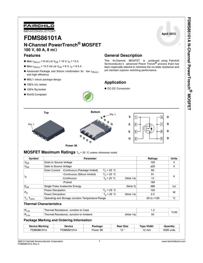 N-Channel Dual Cool<sup>TM 56 PowerTrench<sup>® MOSFET 100V, 60A, 7.5mΩ