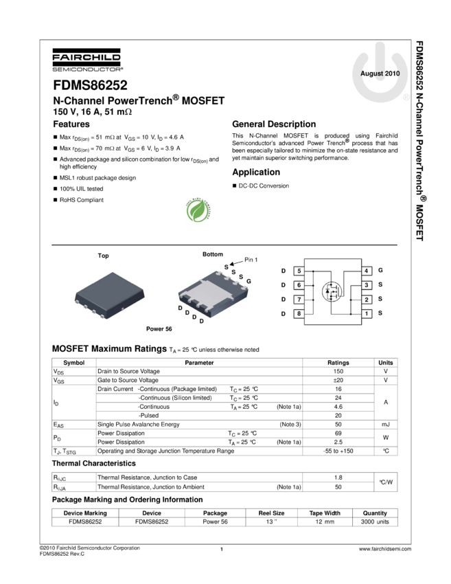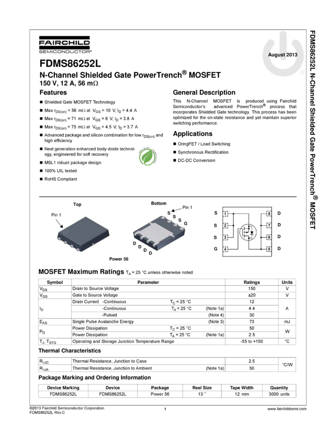 N-Channel Shielded Gate PowerTrench<sup>® MOSFET 150V, 12A, 56mΩ