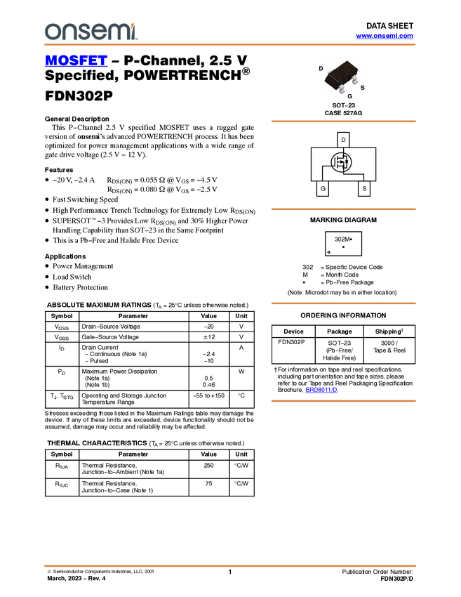 P-Channel 2.5V Specified PowerTrench<sup>® MOSFET -20V, -2.4A, 55mΩ