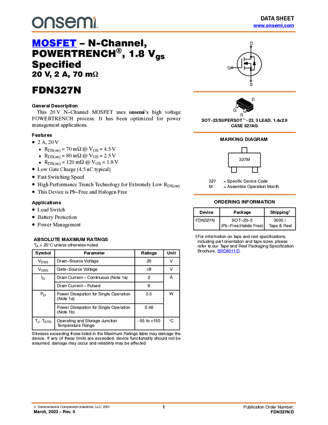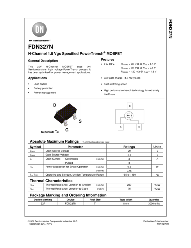 N-Channel 1.8 V<sub>gs Specified PowerTrench<sup>® MOSFET 20V, 2A, 70mΩ
