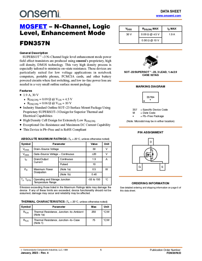 N-Channel Logic Level Enhancement Mode Field Effect Transistor 30V, 1.9A, 90mΩ