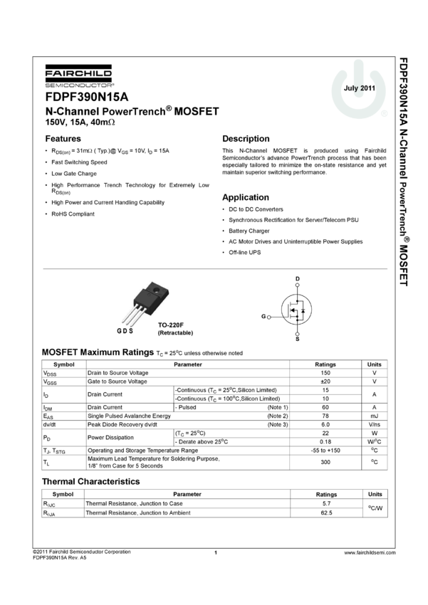 N-Channel PowerTrench<sup>®</sup> MOSFET 150V, 15A, 40mΩ
