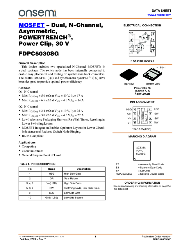 30 V dual package. The switch node has been internally connected toPowerTrench® Power Clip