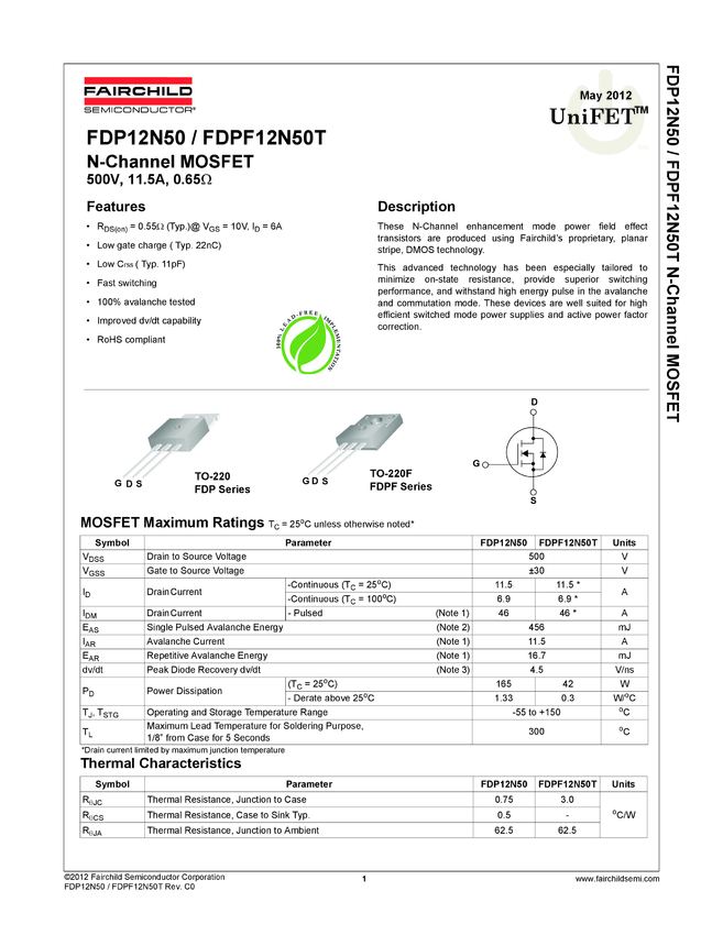N-Channel UniFETTM MOSFET 500V, 11.5A, 650mΩ
