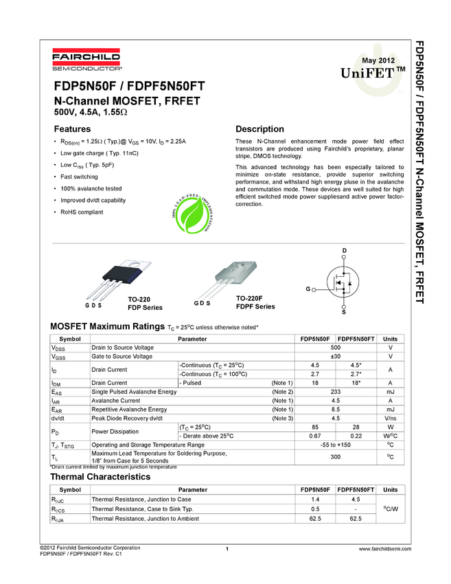 N-Channel UniFETTM FRFET® MOSFET 500V, 4.5A, 1.55Ω
