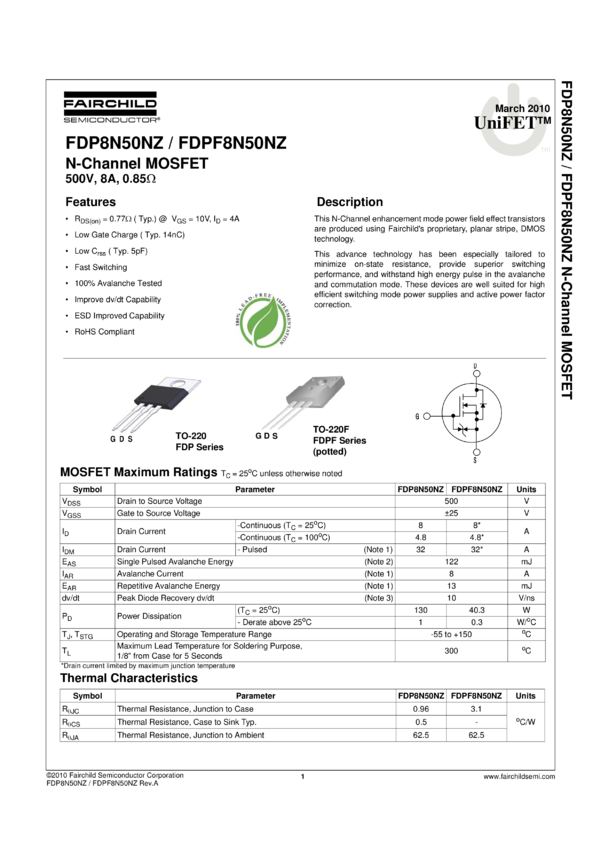 N-Channel UniFETTM II MOSFET 500V, 8A, 850mΩ