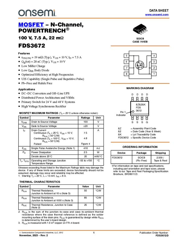 N-Channel PowerTrench<sup>® MOSFET, 100V, 7.5A, 22mΩ
