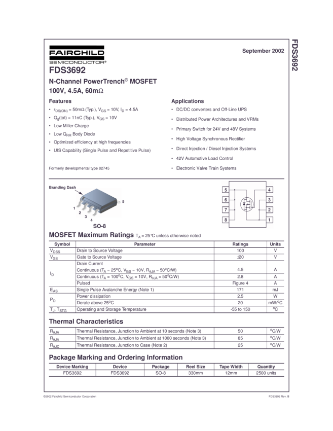 Discrete Commercial N-Channel UltraFET Trench MOSFET, 100V, 4.5A, 0.060 Ohm @ Vgs = 10V, SO-8 Package