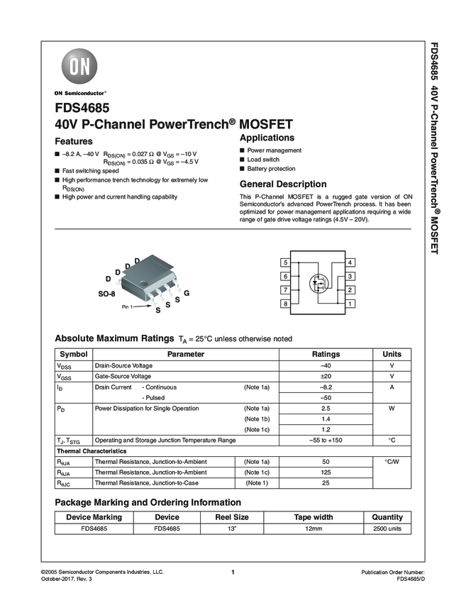 40V P-Channel PowerTrench<sup>® MOSFET -8.2A, 27mΩ