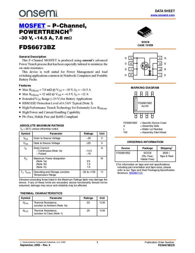 P-Channel PowerTrench<sup>® MOSFET -30V, 14.5A, 7.8mΩ