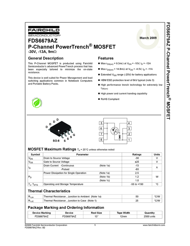 P-Channel PowerTrench<sup>® MOSFET -30V, -13A, 9mΩ