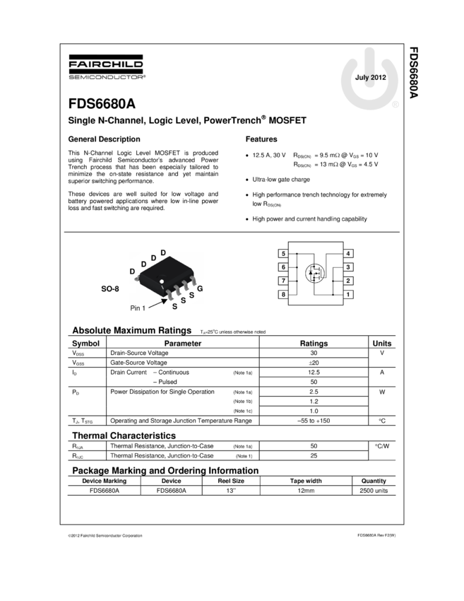Single N-Channel, Logic Level, PowerTrench<sup>® MOSFET 30V, 12.5A, 9.5mΩ
