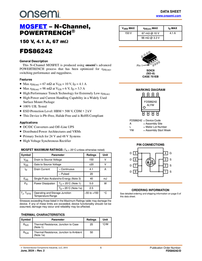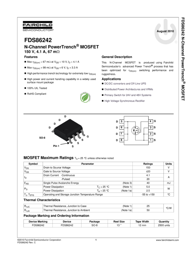 N-Channel PowerTrench<sup>® MOSFET 150V, 4.1A, 67mΩ