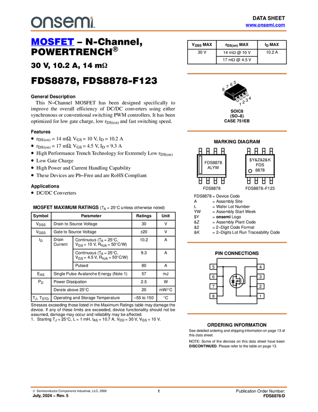 N-Channel PowerTrench<sup>® MOSFET 30V, 10.2A, 14mΩ