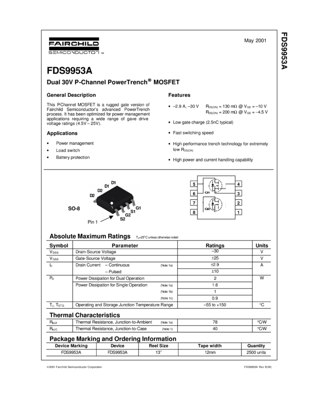 Dual P-Channel PowerTrench<sup>® MOSFET, 30V, -2.9A, 130mΩ