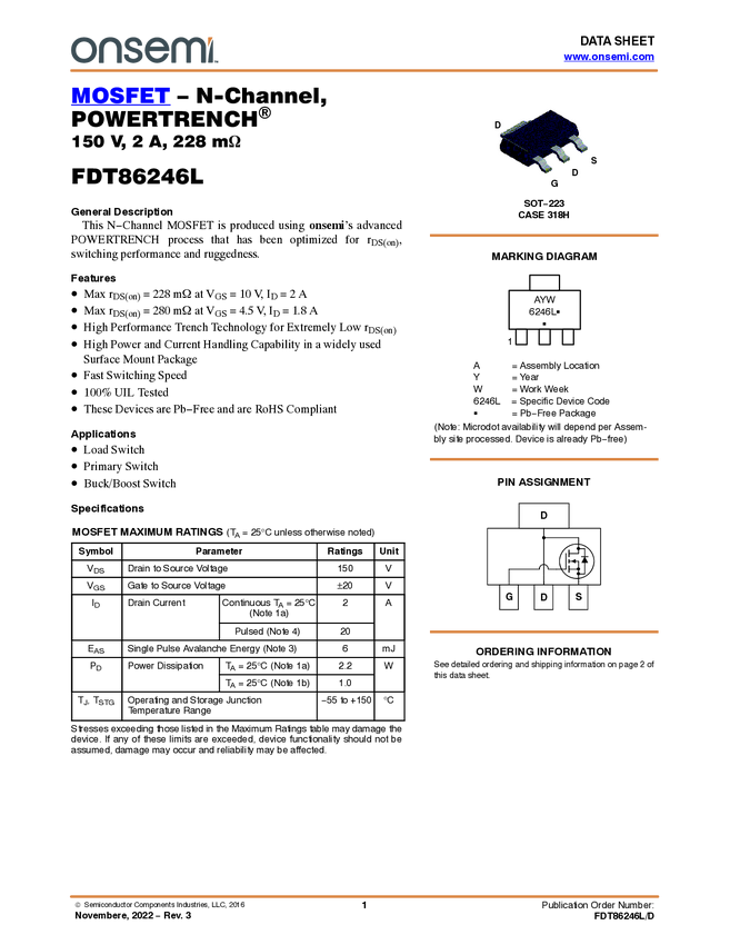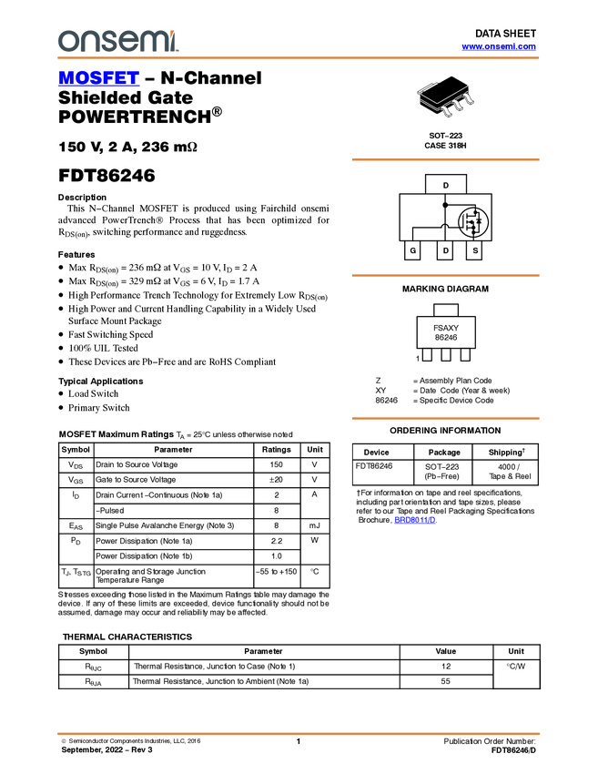 N-Channel PowerTrench<sup>® MOSFET 150V, 2A, 228mΩ