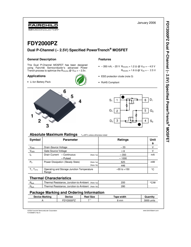 Dual P-Channel Specified PowerTrench<sup>® MOSFET -20V, -0.35A, 1.2Ω