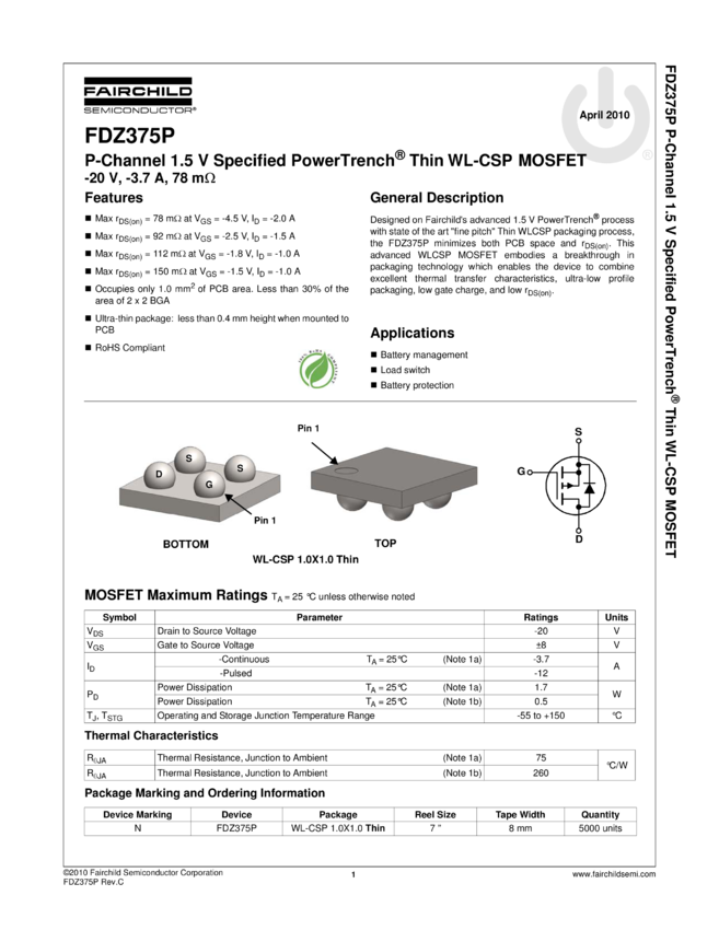 P-Channel 1.5V Specified PowerTrench<sup>® Thin WL-CSP MOSFET -20V, -3.7A, 78mΩ