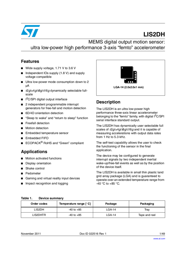 MEMS digital output motion sensor: ultra low-power high performance 3-axes femto accelerometer