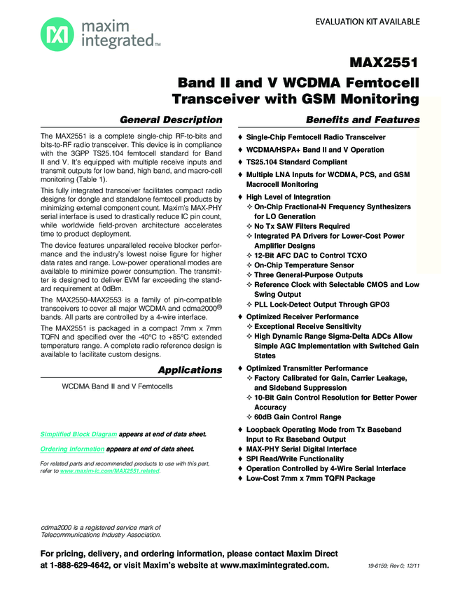 MAX2551 Band II and V WCDMA Femtocell Transceiver with GSM Monitoring