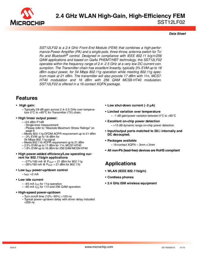 2.4 GHz WLAN High-Gain, High-Efficiency FEM - SST12LF02 (01/27/2015)