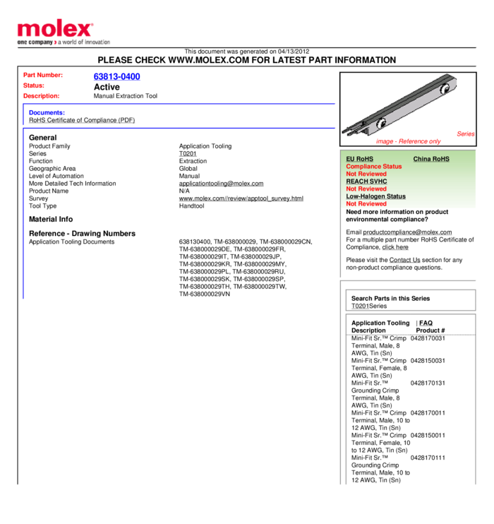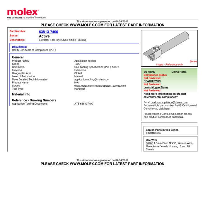 Extraction Tool for 42815 and 42817 Mini-Fit Sr. Male and Female Terminals