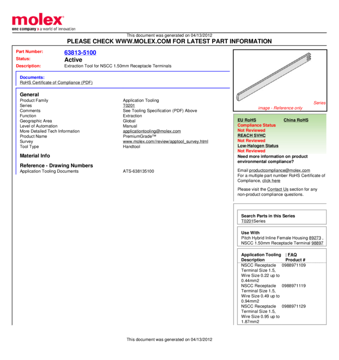 Extractor Tool for 98897 Series NSCC Receptacle Terminals and 89273 Series Female Housings