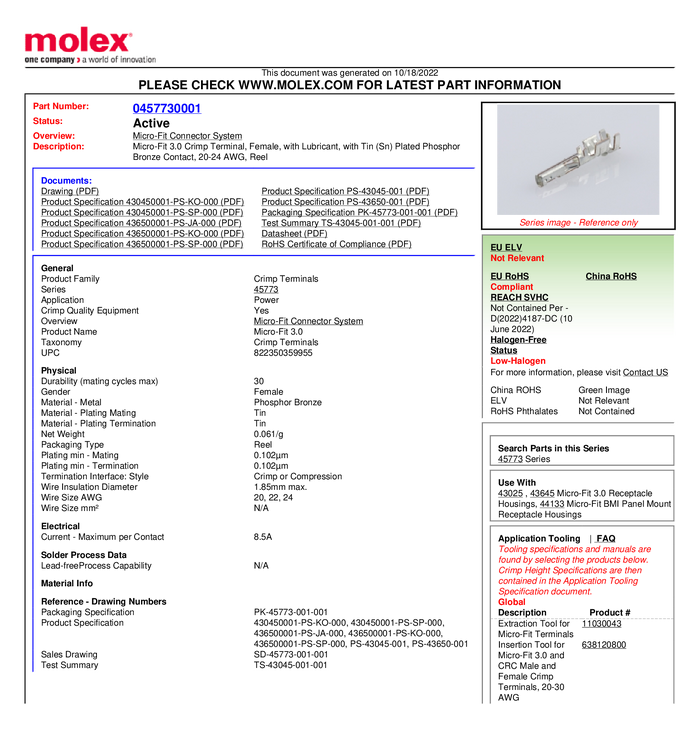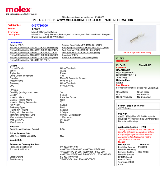 Molex 457730001 Microfit Female Term 457730001 Molex Zawartość: 1 szt.