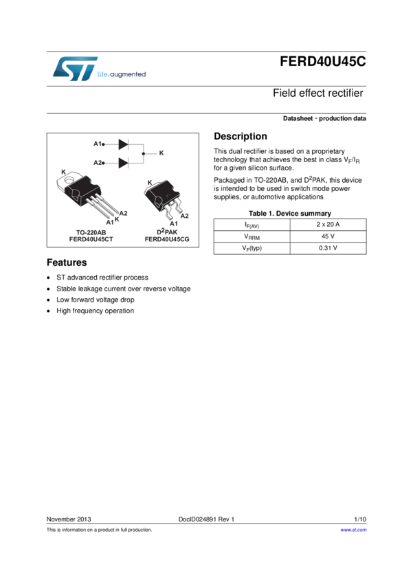 Field-Effect Rectifier Diode (non Schottky) 45V 40A 3-Pin D2PAK T/R