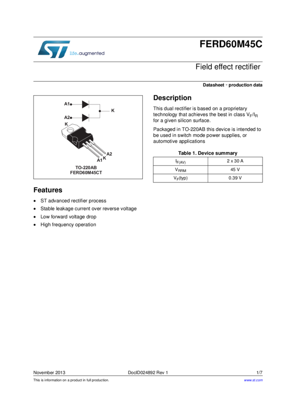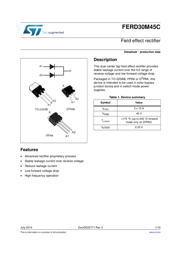 Field-Effect Rectifier Diode (non Schottky) 45V 30A 3-Pin D2PAK T/R