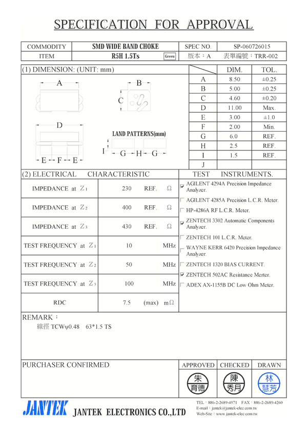 Dławik ferrytowy, osiowy, 1.5-zwojowy, SMD, 5MHz - 1GHz, Z=230Ω przy 10MHz, Z=400Ω przy 50MHz, Z=430Ω przy 100MHz, R= 7.5 mΩ