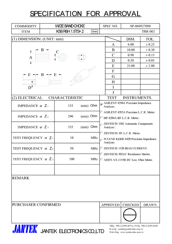 Dławik ferrytowy, osiowy, 1.5 x 2 -zwojowy, Z=155Ω przy 10MHz, Z=290Ω przy 50MHz, Z=335Ω przy 100MHz