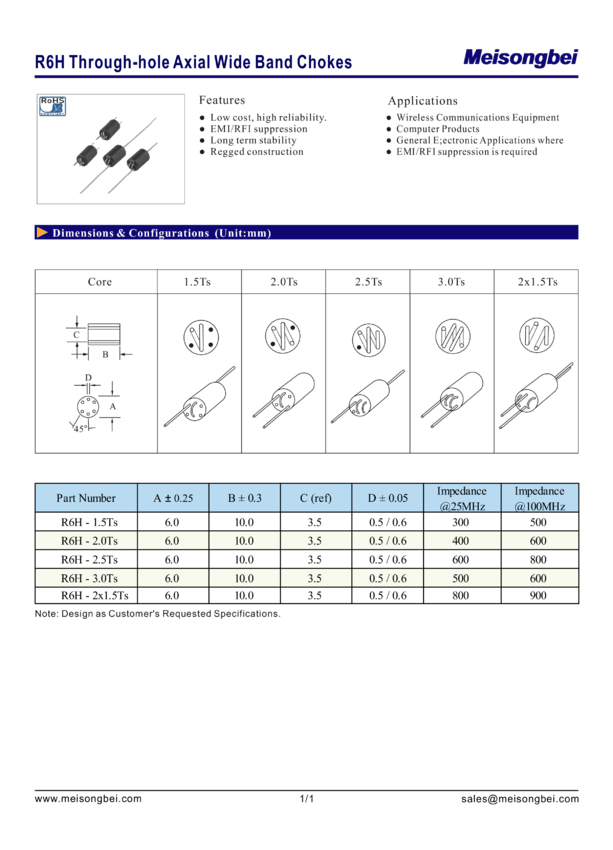 Dławik ferrytowy, osiowy, 1.5-zwojowy, [R6H1.5TS], Z=300Ω przy 25MHz, Z=500Ω przy 100MHz, Meisongbei
