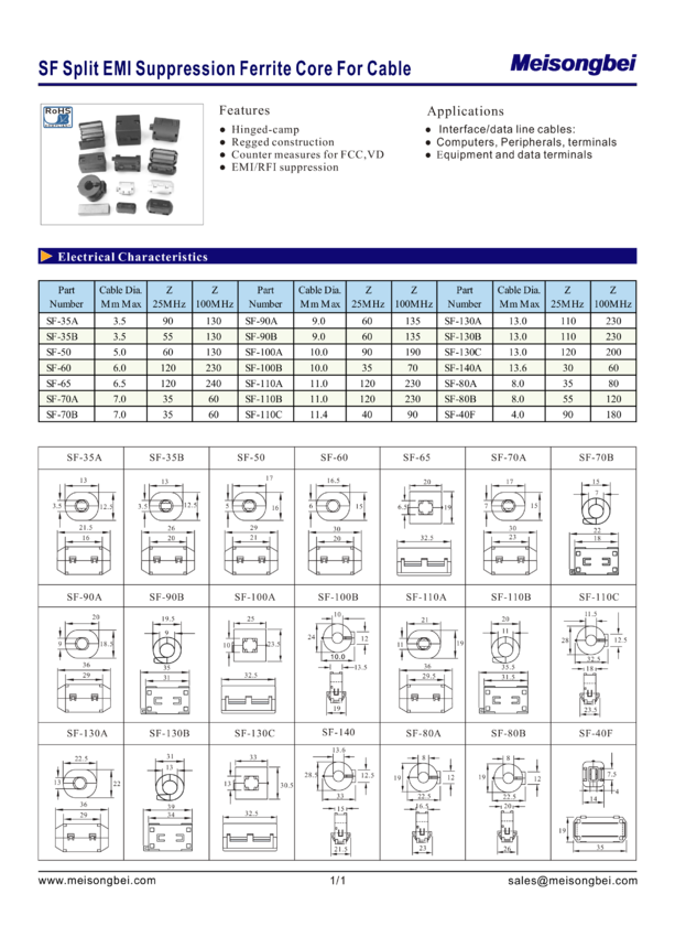 Rdzeń ferrytowy, EMI, do kabli okrągłych, , [SF110B], Z=120Ω przy 25MHz, Z=230Ω przy 100MHz, Meisongbei