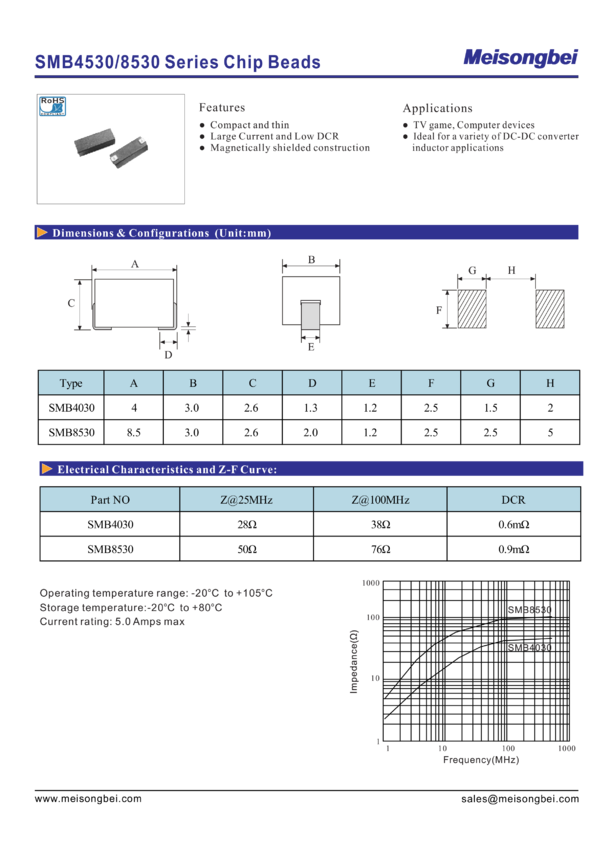 Ferryt EMI, Z1=30Ω przy 25MHz, Z2=47Ω przy 100MHz, R=3mΩ Imax=5A, do montażu SMD, [SMB4030], Meisongbei