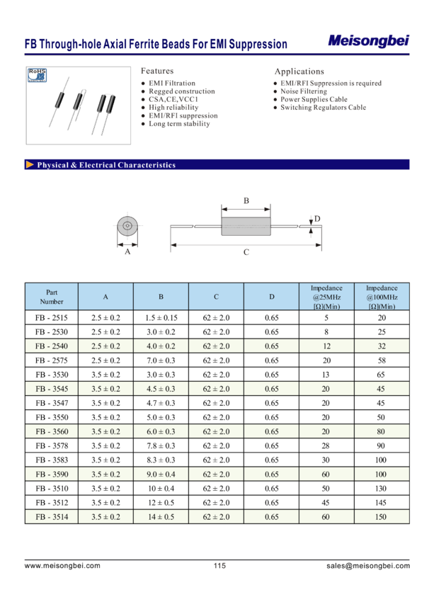 Miniaturowy koralik ferrytowy, D3.5 mm x L6.0 mm, [FB3560], Z=20Ω przy 25MHz, Z=80Ω przy 100MHz Meisongbei